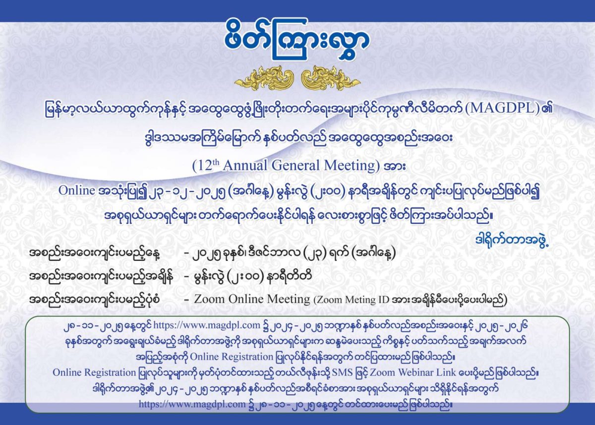 We would like like to invite all share holders to Myanma Agricultural & General Development Public Co., Ltd (MAGDPL)’s 12th Annual General Meeting as follows;